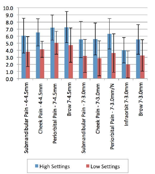 총 31명의 실험자를 기준으로 울쎄라의 에너지 강도를 각각 레벨 4(High Setting / 파란 막대), 레벨 2(Low Setting / 빨간 막대)로 셋팅한 후 부위별로 시술을 진행해 통증 강도를 확인하는 실험인데요.