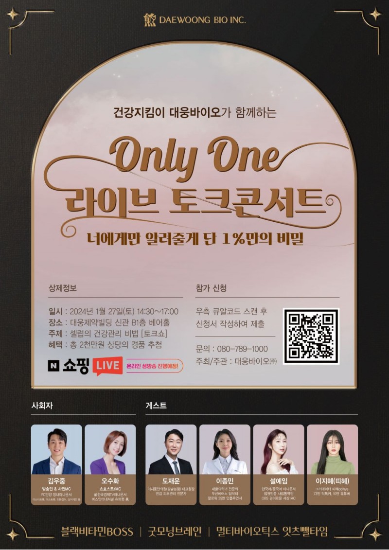 대웅바이오에서 진행한 이번 라이브 토크쇼는 '너에게만 알려줄게, 단 1%만의 비밀'을 주제로 셀럽들의 건강관리 비법에 대한 토크가 진행되었습니다.
